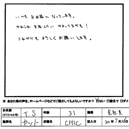 いつもお世話にないいてます。かれこれ8年くらい通っているかも!これからも宜しくお願いします。
