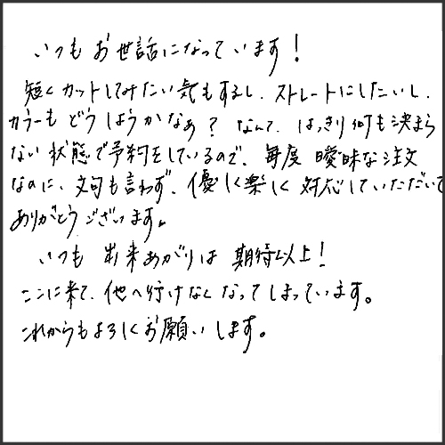 いつもお世話になっています!短くカットしてみたい気もするし、ストレートにしたいし、カラーもどうしようかな?なんて、はっきり何も決まらない状態で予約をしているので、毎度、曖昧な注文なのに、文句もいわず、優しく楽しく対応していただいでありがとうございます。いつも出来上がりは期待以上!ここに来て、他へ行けなくなっています。これからも宜しくお願いします。