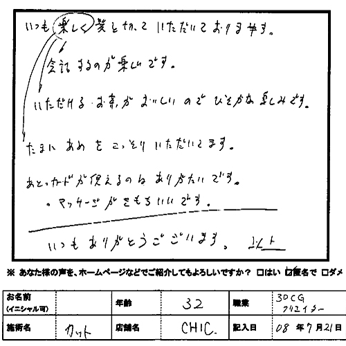 いつも楽しく髪を切って頂いております。会話するのが楽しいです。頂けるお茶が美味しいので密かな楽しみです。たまにアメをこっそり頂いています。あとカードが使えるのはありがたいです。マッサージが気持ち良いです。いつもありがとうございます。以上