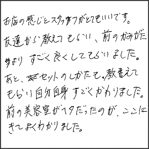 お店の感じとスタッフがとてもいいです。友だちから教えてもらい、前の髪型より凄く良くしてもらいました。あと、セットの仕方も教えてもらい自分自身が凄く変わりました。前の美容院が下手だったのが、ここに来てよくわかりました。