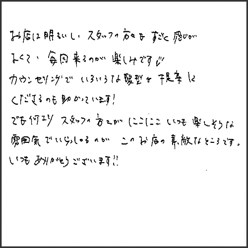 お店は明るいしスタッフの方々も凄く感じが良くて、毎回来るのが楽しみです。カウンセリングで色々な髪型を提案してくださるのも助かっています。でも何よりスタッフの方々がニコニコいつも楽しそうな雰囲気でいらっしゃるのが、このお店の素敵なところです。いつもありがとうございます。