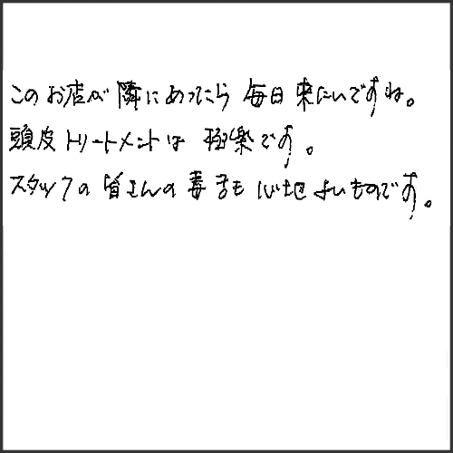 このお店が隣にあったら毎日来たいですね。頭皮トリートメントは極楽です。スタッフの皆さんの毒舌も心地よいものです。