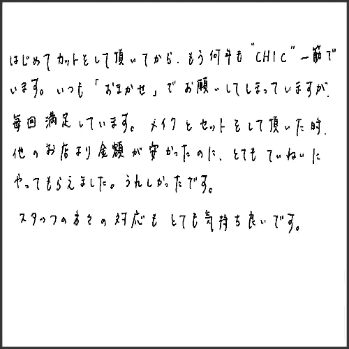 はじめてカットをして頂いてから、もう何年もCHIC一筋でいます。いつも「おまかせ」でお願いしてしまっていますが、毎回満足しています。メイクとセットをして頂いた時、他のお店より金額が安かったので、とても丁寧にやってもらえました。嬉しかったです。スタッフの方々の対応もとても気持ち良かったです。
