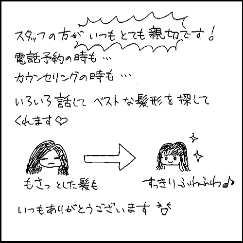 。電話予約の時も…カウンセリングの時も…いろいろ話してベストな髪型を探してくれます。いつもありがとうございます。