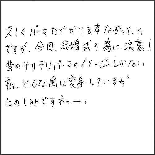 久しくパーマなどかける事なかったのですが今回、結婚式の為に決意!昔のちりちりパーマのイメージしかない私、どんな風に変身しているのか楽しみですねぇー。