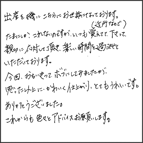 出産を機にこちらにお世話になっております(近所なので)たまにしか、これないのですが、いつも覚えて下さって、親切に応対して頂き、楽しい時間を過ごさせて頂いております。今回、おもいきってボブにしてみましたが、思った以上に可愛く仕上がり、とても嬉しいです。ありがとうございました。これからも色々とアドバイスお願いします。