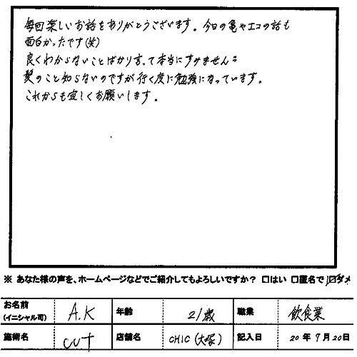 毎回、楽しいお話しをありがとうございます。今日の亀やエコの話も面白かったです(笑)よくわからない事ばかり言って本当にすみません。髪のこと知らないのですが行く度に勉強になっています。これからも宜しくお願いします。