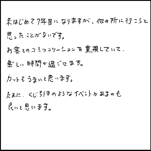 来始めて7年目になりますが、他の所に行こうと思った事がないです。お客様とのコミュニケーションを重視していて、楽しい時間が過ごせます。カットも上手いと思います。たまに、くじ引きのようなイベントがあるのも良いと思います。