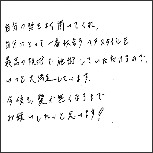 自分の話をよく聞いてくれて、自分にとって一番似合うヘアスタイルを最高の技術で施術していただけるので、いつも大満足しています。今後も髪が無くなるまで、お願いしたいと思います。