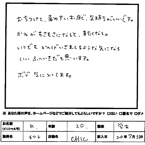 落ち着いて来やすいお店で気持ちが良いです。髪がモサモサになると来たくなる。いつでも歓迎されるような気になるいい雰囲気だと思います。ボブ気に入っています。