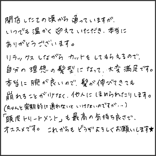 開店したての頃から通っていますが、いつも温かく迎えていただき、本当にありがとうございます。リラックスしながらカットをしてもらえるので、自分の理想の髪型になって大変満足です。本当に腕が良いので髪が伸びてきても崩れる事が少なく、他人に褒められたりします。(ちゃんと定期的に通わないといけないのですが)「頭皮トリートメント」も最高の気持ち良さで、お勧めです。これからもどうぞよろしくお願いします。