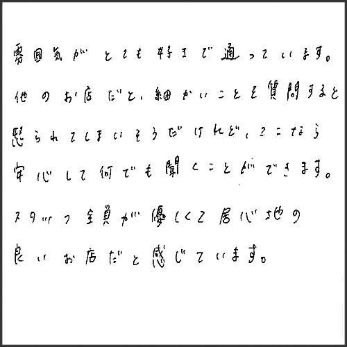 他のお店だと細かい事を質問すると怒られてしまいそうだけど、ここなら安心して何でも聞く事が出来ます。スタッフ全員が優しくて居心地の良いお店だと感じています。