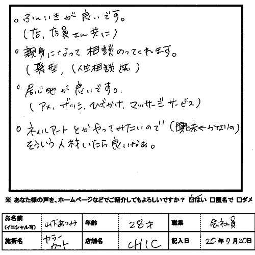 雰囲気が良いです(店、店員さん共に)。親身になって相談にのってくれます(髪型、人生相談)。居心地が良いです(アメ、雑誌、ひざかけ、マッサージサービス)。ネイルアートとかやってみたいので(興味←かなりの)そういう人材がいたら良いなぁ。