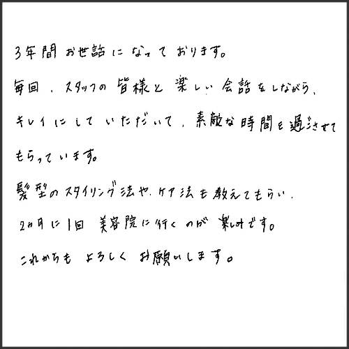 3年間お世話になっております。毎回、スタッフの皆様と楽しい会話をしながら、キレイにして頂いています。素敵な時間を過ごさせてもらっています。髪型のスタイリング方法やケア方法も教えてもらい、2ヵ月に1回美容院に行くのが楽しみです。これからも宜しくお願いします。