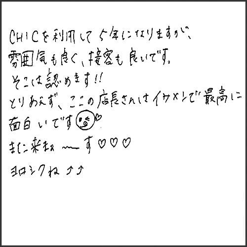 CHICを利用して5年になりますが、雰囲気も良く、接客も良いです。そこは認めます!!とりあえず、ここの店長さんはイケメンで最高に面白いです。また来ま~す。ヨロシクね。